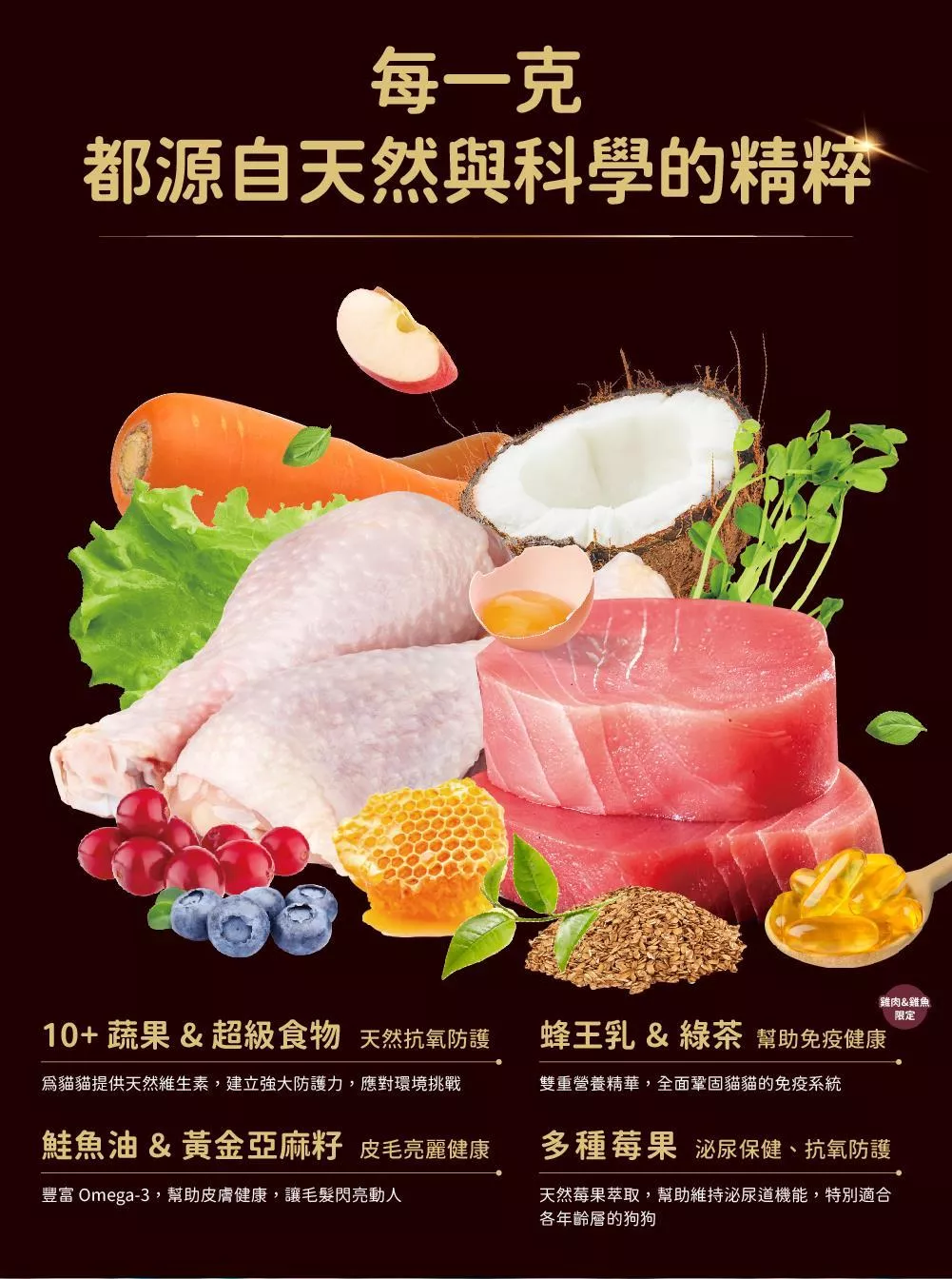 - 皮毛健康:鮭魚油+亞麻籽,亮毛護膚、維持健康膚質